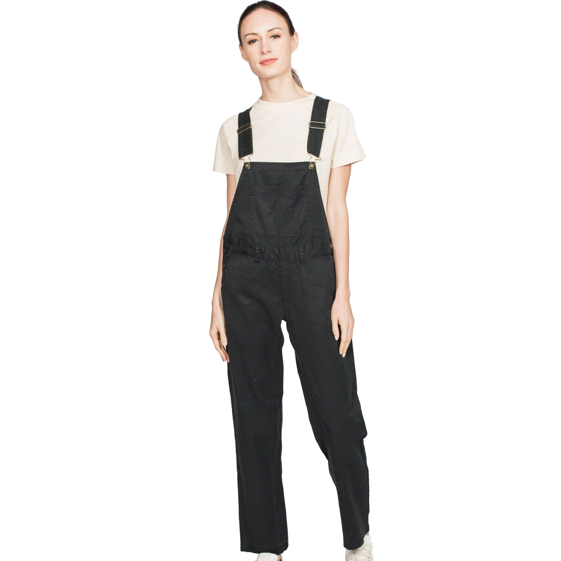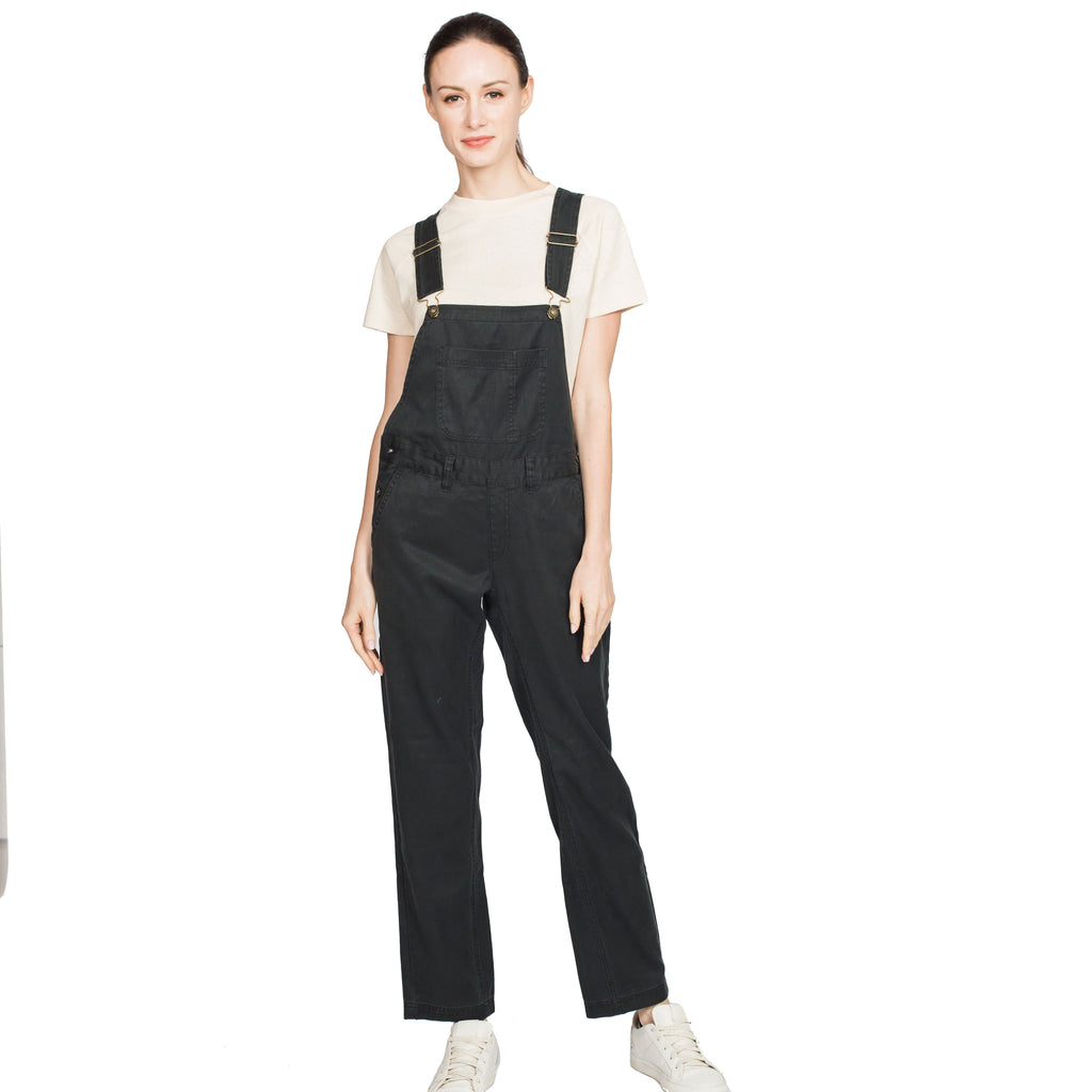 Adjustable straps to fit various heights. Tack button closure at side seams. Full inseam gusset for comfort. Stash pocket. Back drop-in pockets. Front hand pockets.